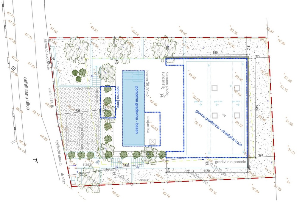 Das Grundstück hat eine Fläche von 659 m² und ist mit einem terrassenförmig an-