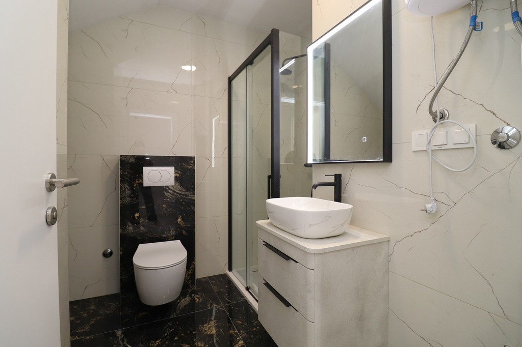 Moderne Keramik, Fußbodenheizung mit Wärmepumpe in der gesamten Wohn-ung elegante Sanitäranlagen, PVC-Fenster mit Rollläden, einbruchsichere Ein-