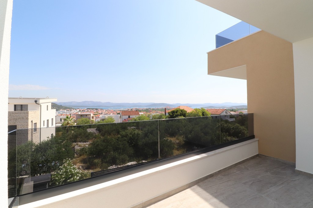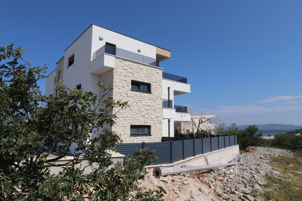 Auf der Insel Murter wird eine Neubau-Wohnung mit überdachtert Terrasse und Meerblick zum Kauf angeboten.